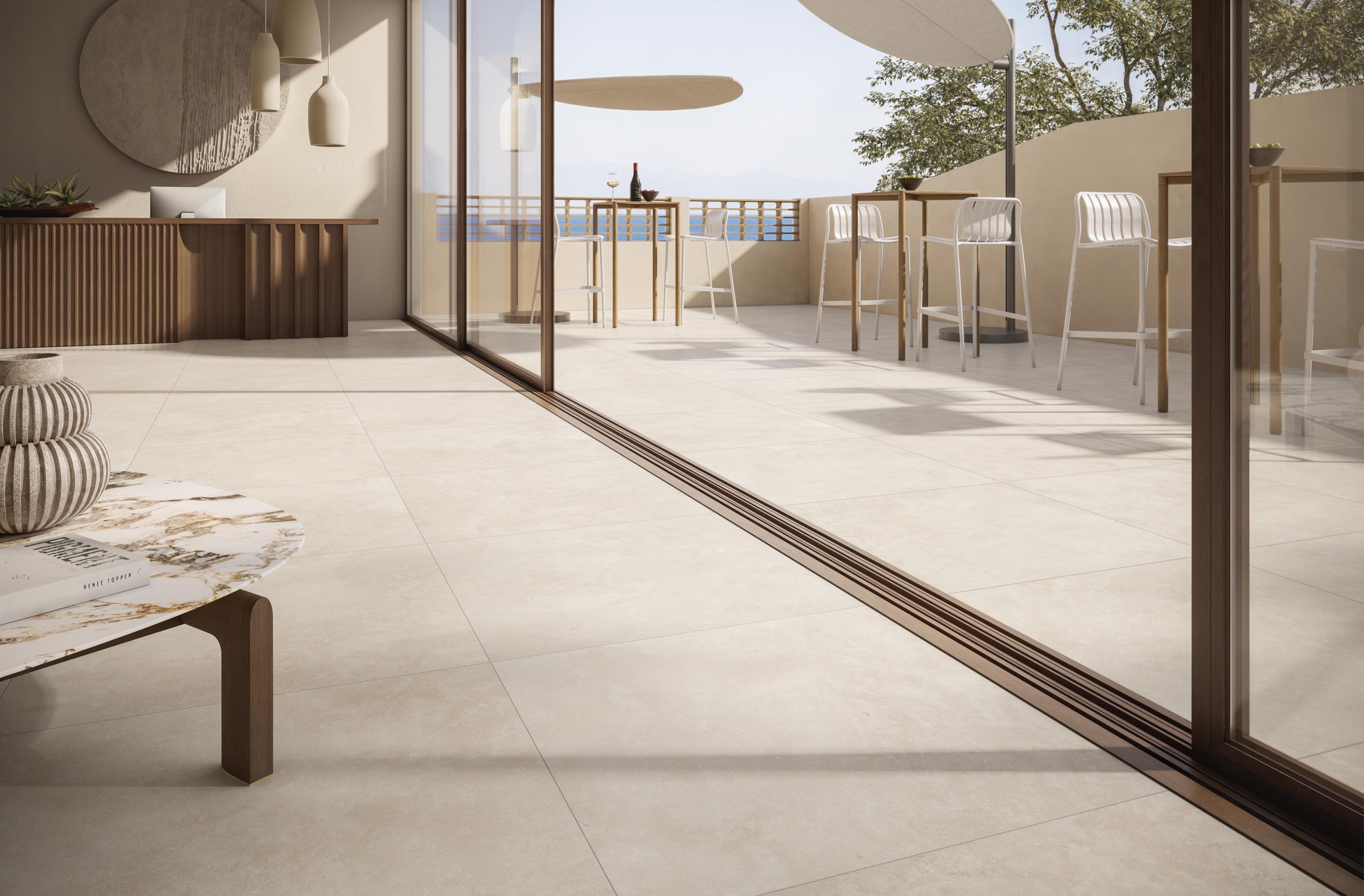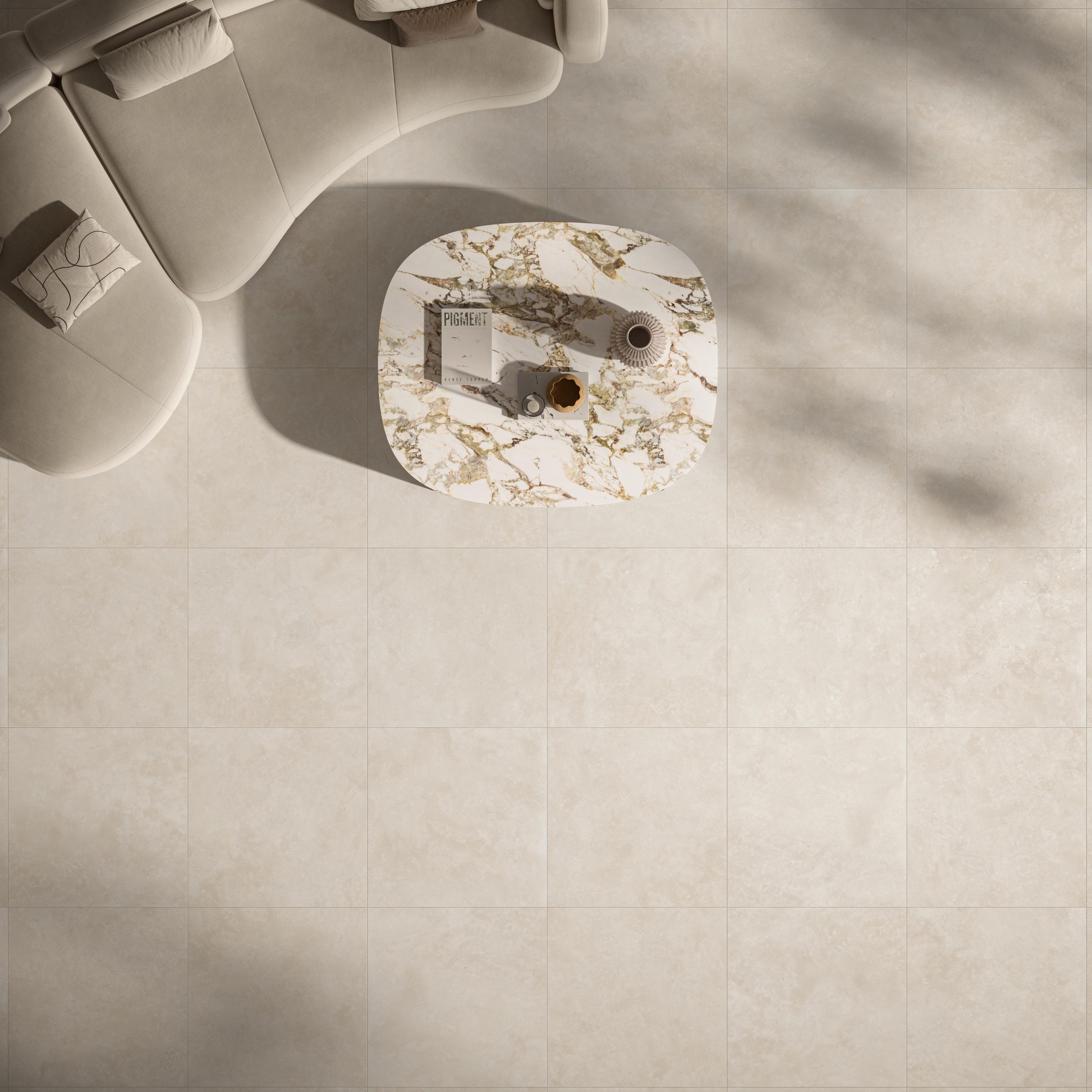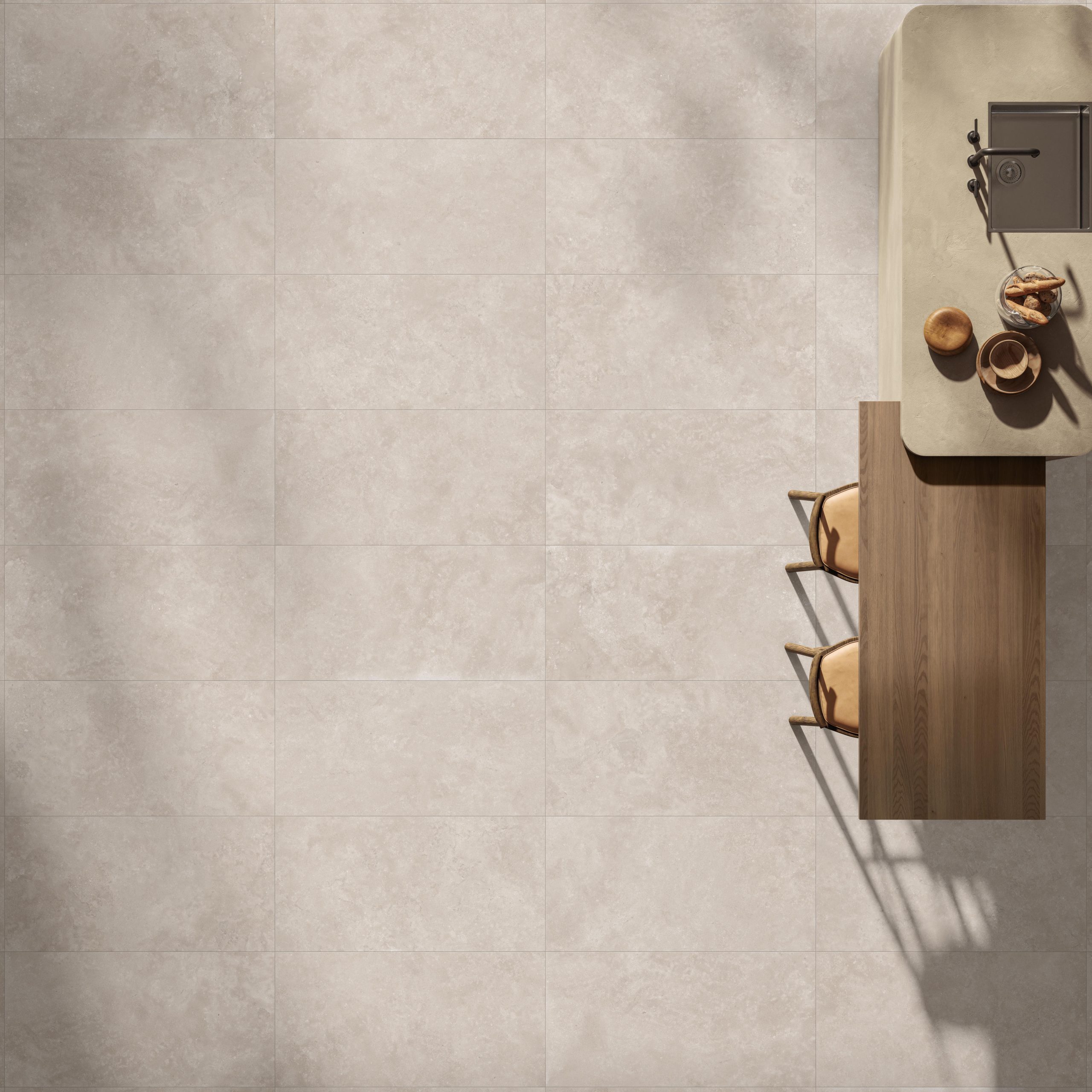 Novoceram a imaginé Théra comme une matière de transition, à la frontière entre nature et architecture. Son esthétique délicate traduit la sérénité des paysages de pierre, tout en apportant la modernité épurée du béton. Cette double identité lui confère une polyvalence rare : elle s’adapte aussi bien aux espaces minimalistes qu’aux ambiances plus chaleureuses.