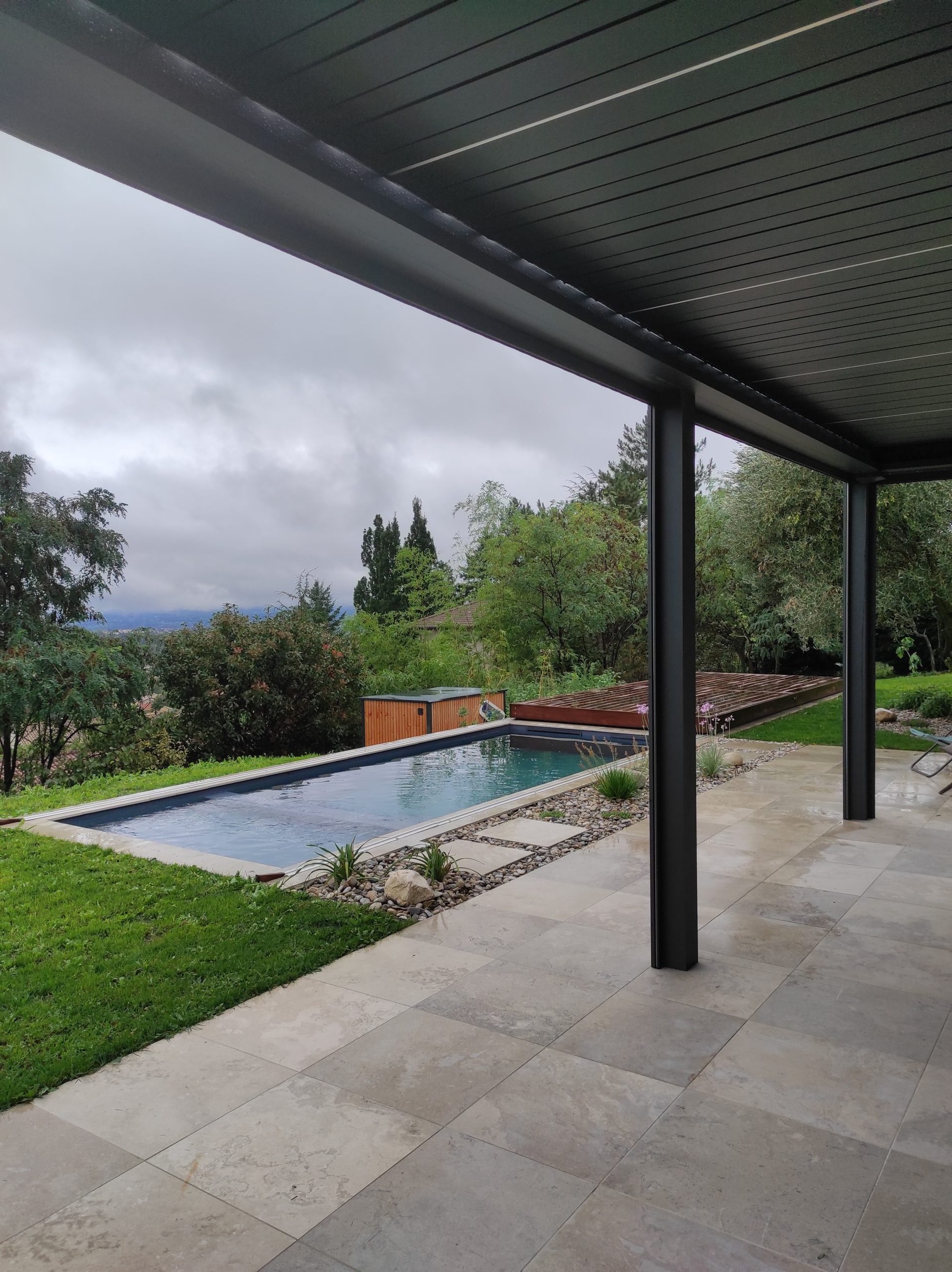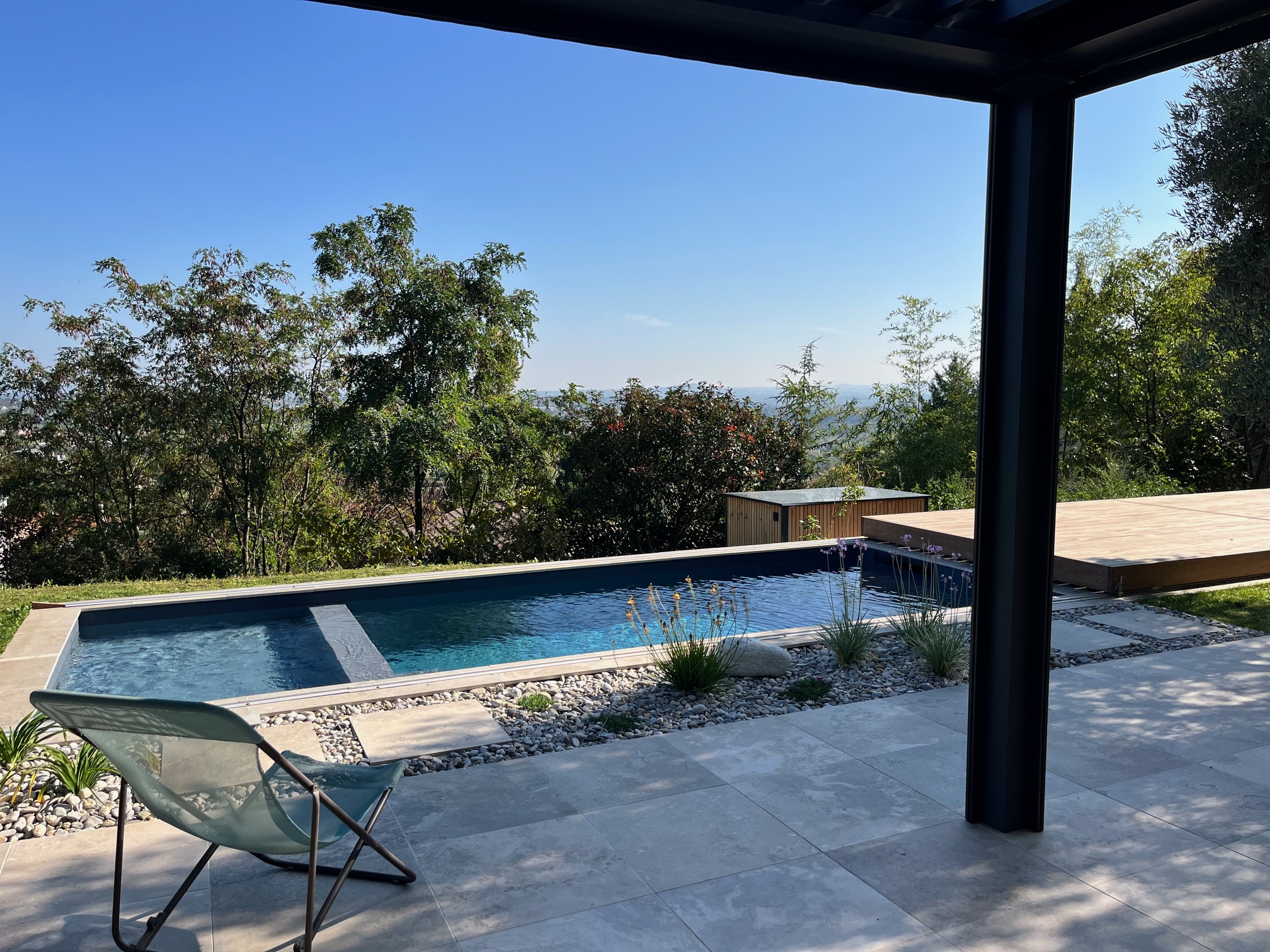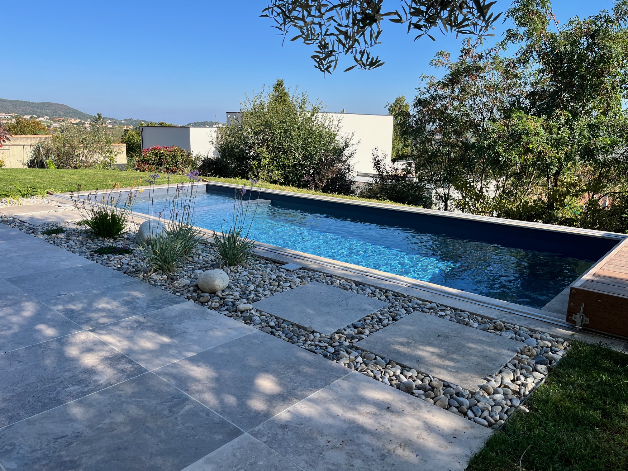 Au cœur de l’aménagement, la collection Solithe habille avec élégance l’ensemble du projet, de la terrasse aux margelles, pour une unité visuelle à la fois naturelle et raffinée. Pour compléter cet espace, une terrasse en bois sur rail a été intégrée : un choix à la fois esthétique et pratique, qui permet de couvrir le bassin en toute sécurité, sans rompre l’harmonie créée par Solithe.