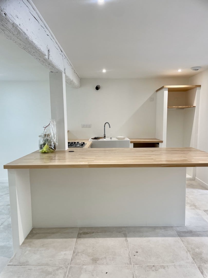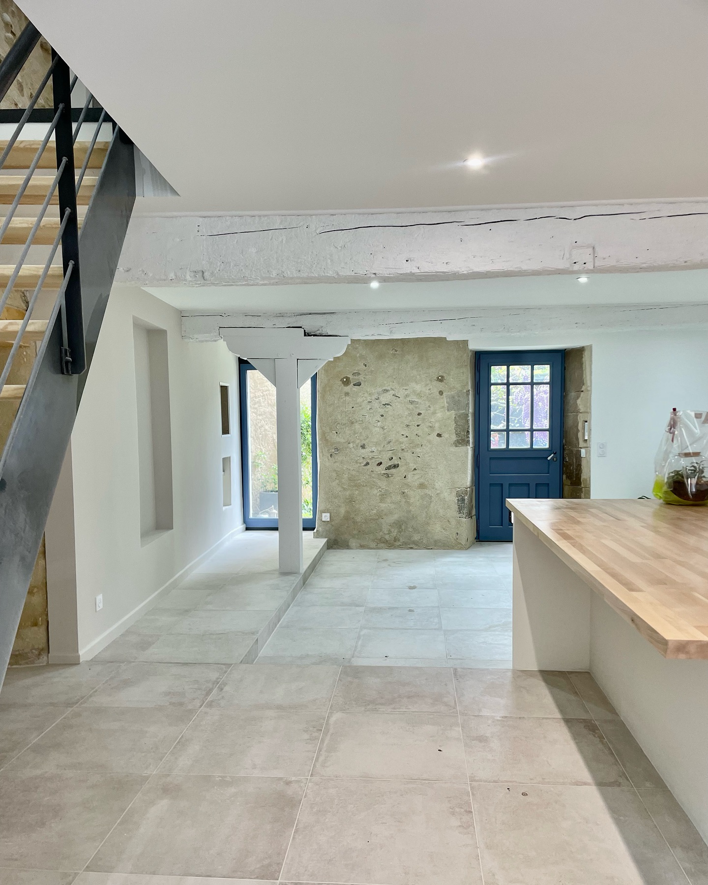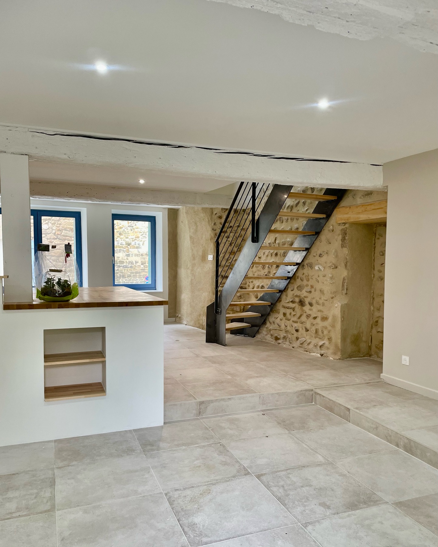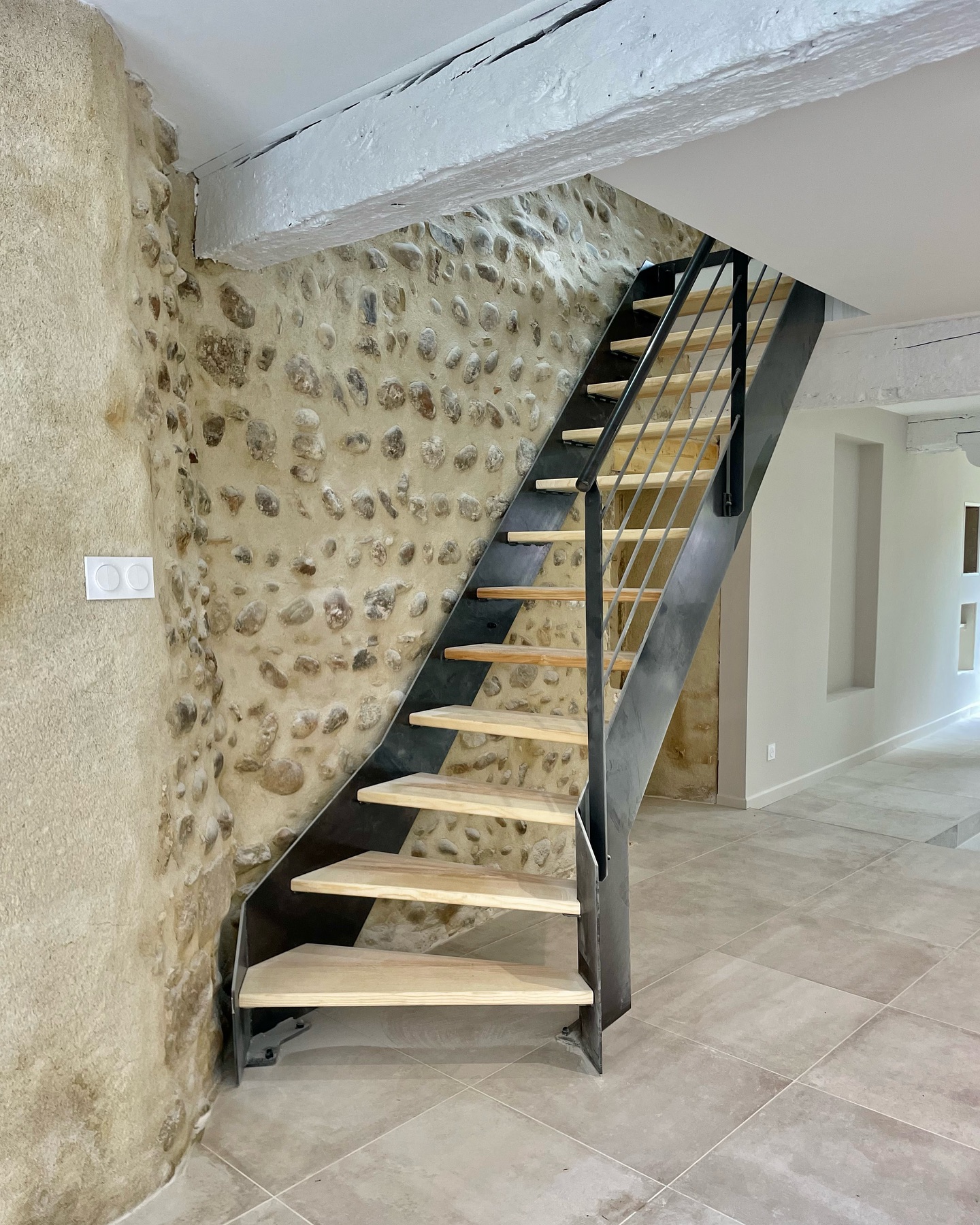 Au rez-de-chaussée, le sol a été habillé avec la collection Château Gris de Novoceram. Son esthétique, inspirée des pierres anciennes, s’intègre naturellement à l’existant et accompagne l’authenticité du lieu.
