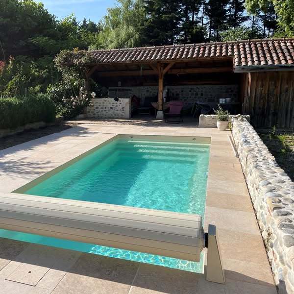 La plage de piscine a été entièrement rénovée avec la collection Tiber, dont les nuances inspirées du travertin s’accordent harmonieusement avec le muret en pierres adjacent.